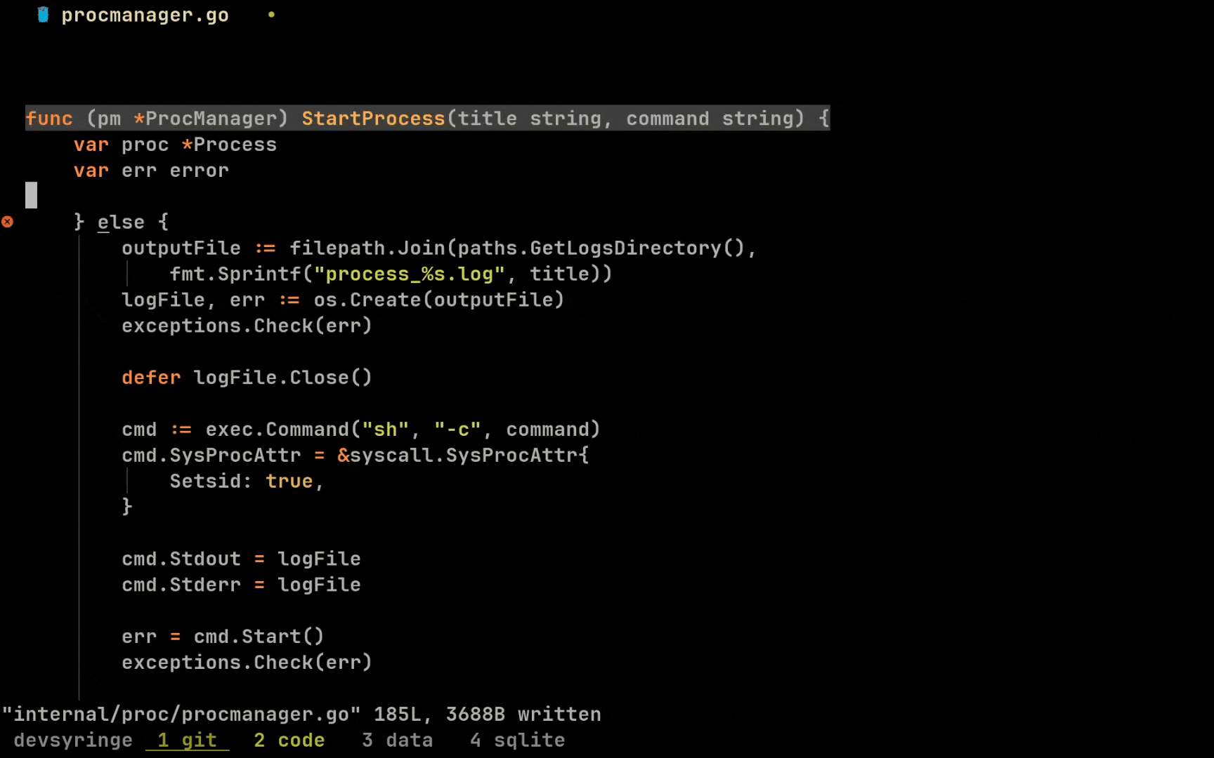 proc, err := pm.findProcess(filter.ByTitle(title))And my workflow in my code editor is very comfortable: