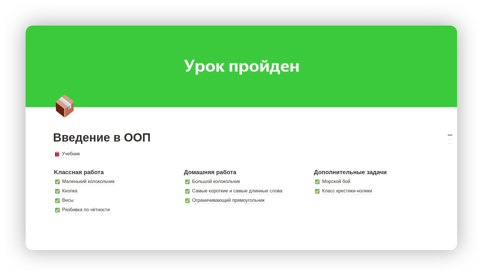 Все задания и теоретические материалы будут вам открываться по мере прохождения на платформе: